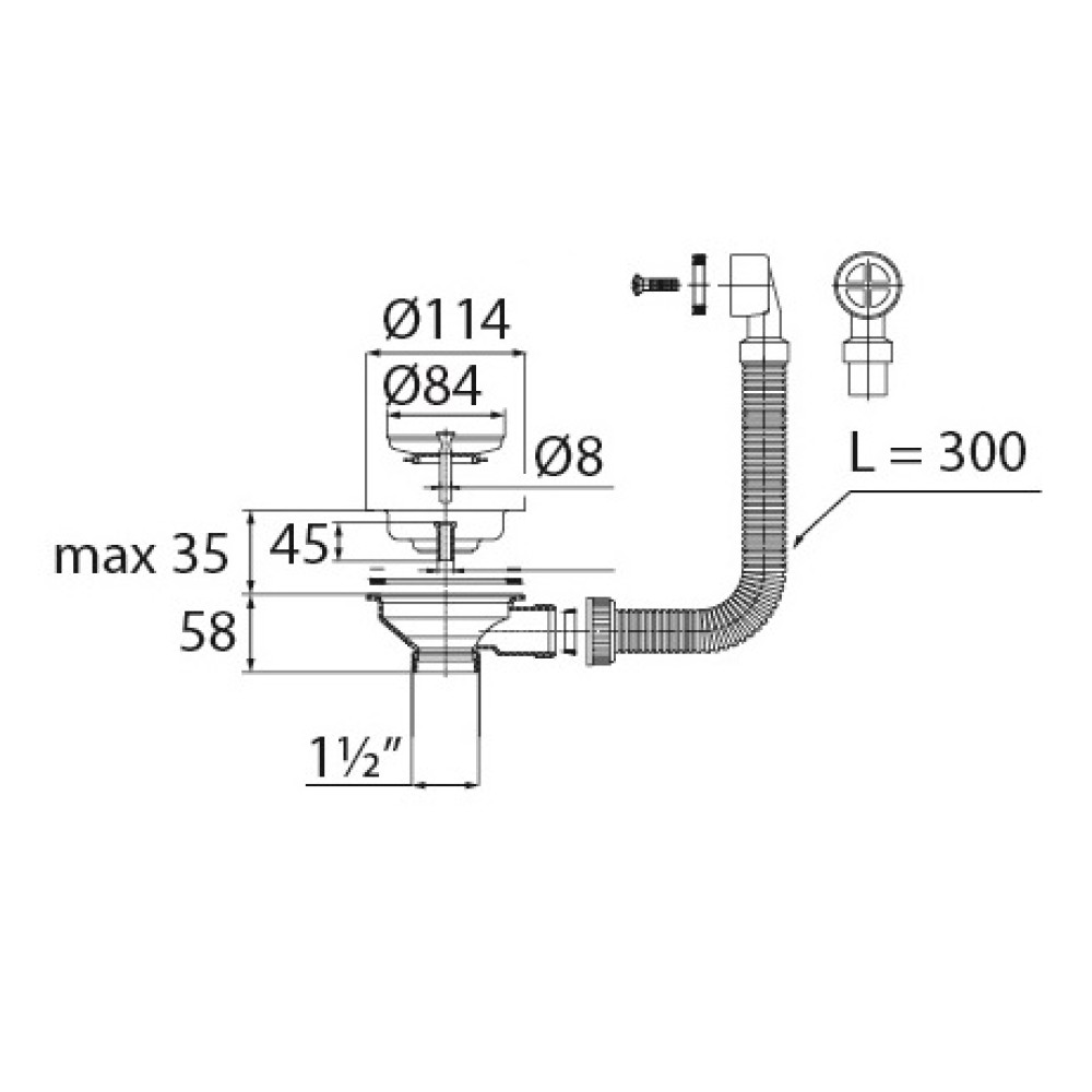 Выпуск "Элит" d- 114 мм 3 1/2 " с нержавеющей чашкой, с круглым переливом L- 300 мм и фильтром- пробкой