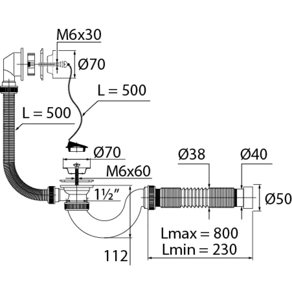 Сифон "Мини Элит" для ванны с нержавеющей чашкой d- 70 мм, с переливом и гофротрубой (1 1/2"х 40/50 мм)