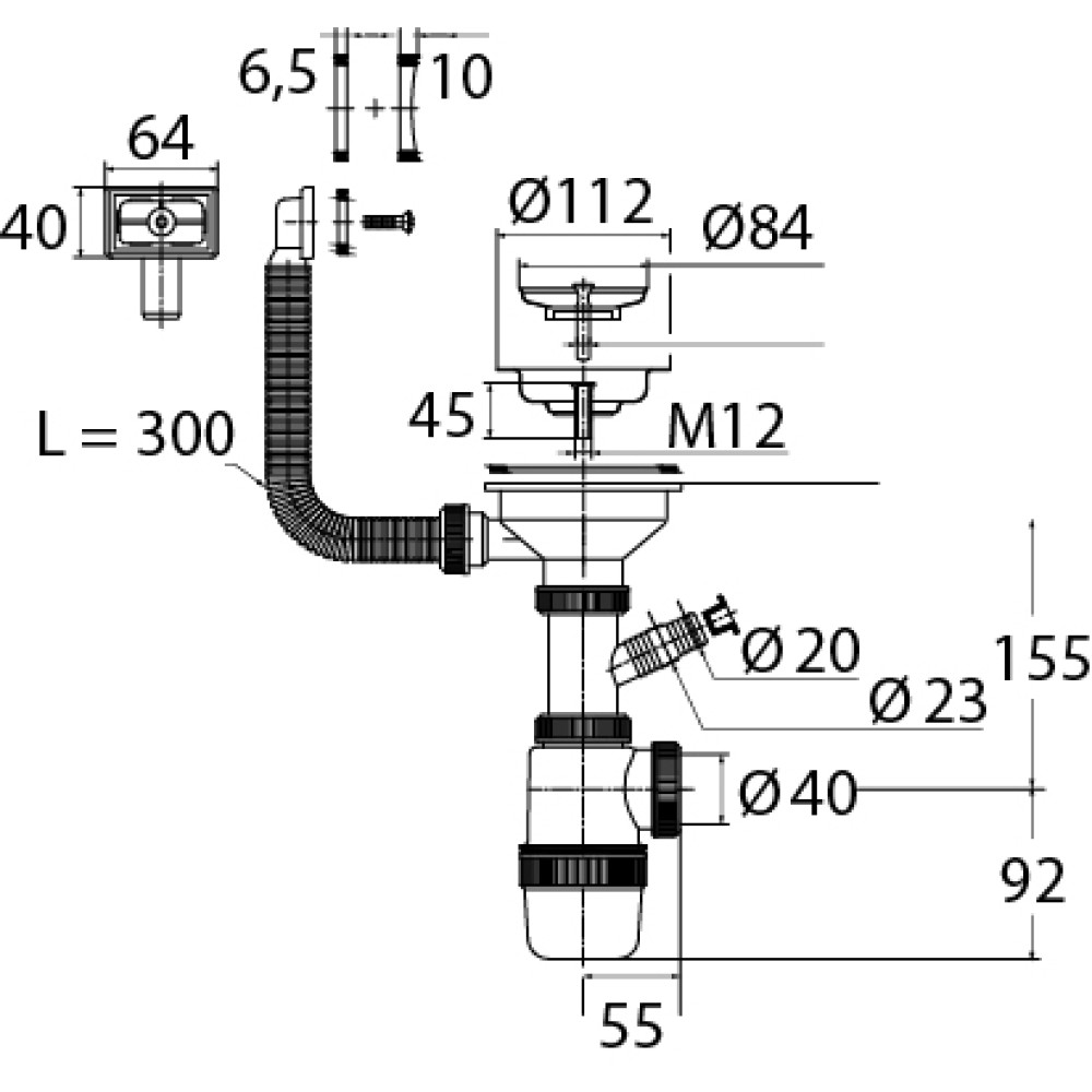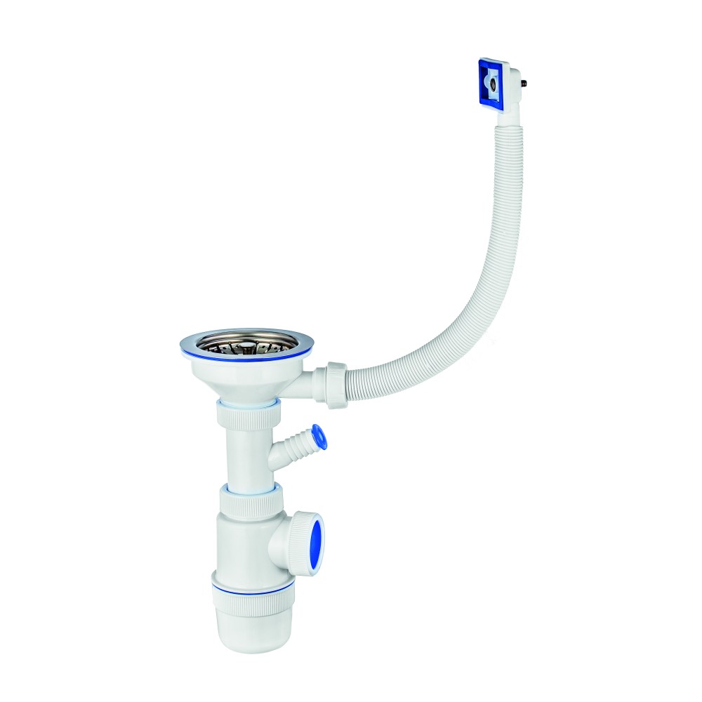 Комплектация: корпус сифона с отводом, выпуск с отводом, чашка, пробка-фильтр, гофрированный перелив, гайки - 4 шт. прокладки - 6 шт. винт