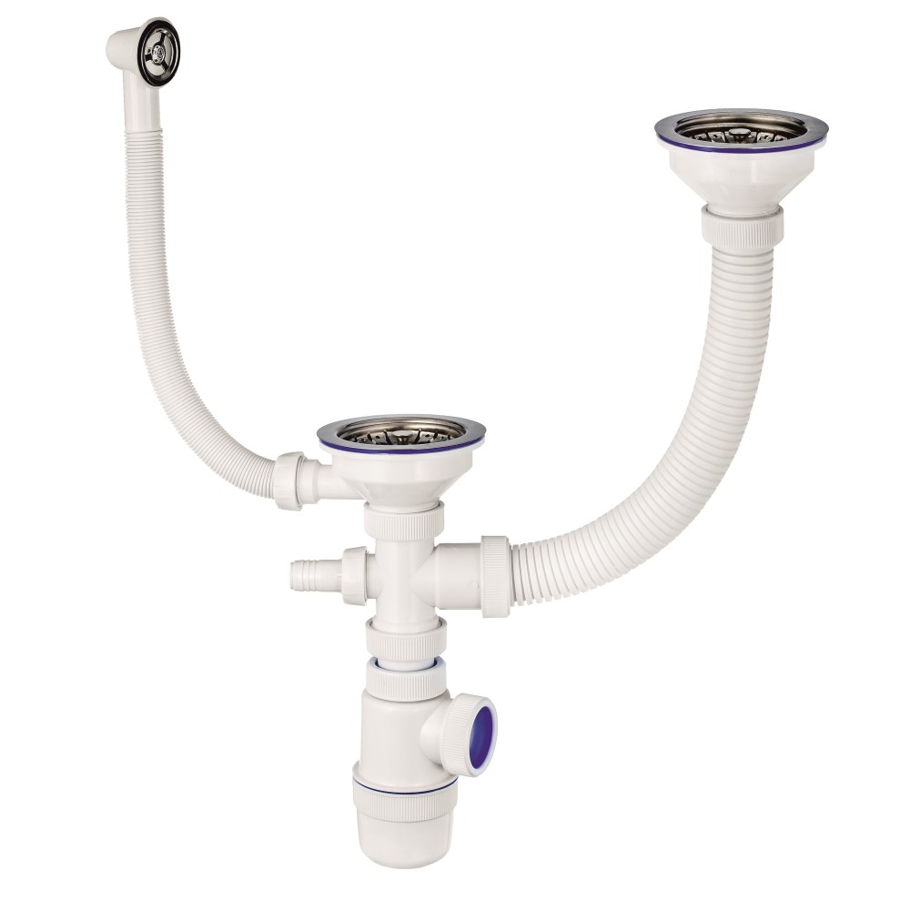 Комплектация: корпус сифона, переходник с 2-мя отводами, соединительная гофротруба, выпуск с отводом, выпуск, чашка- 2 шт. пробка-фильтр - 2шт.  гофрированный перелив, гайки - 6 шт. прокладки - 6 шт. винт-2шт.
