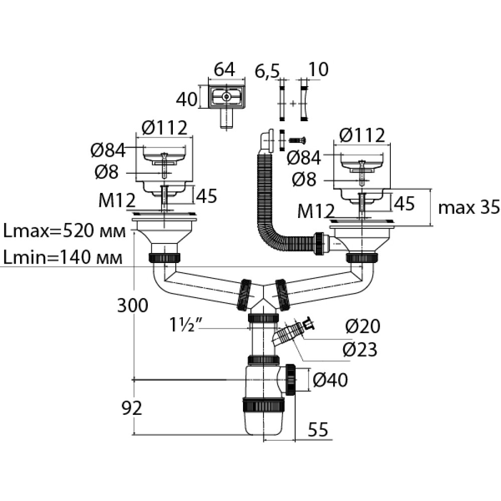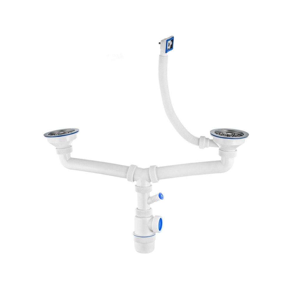 Модель сифона: двойной с отводом (для стиральной машины) и переливом для кухонной мойки